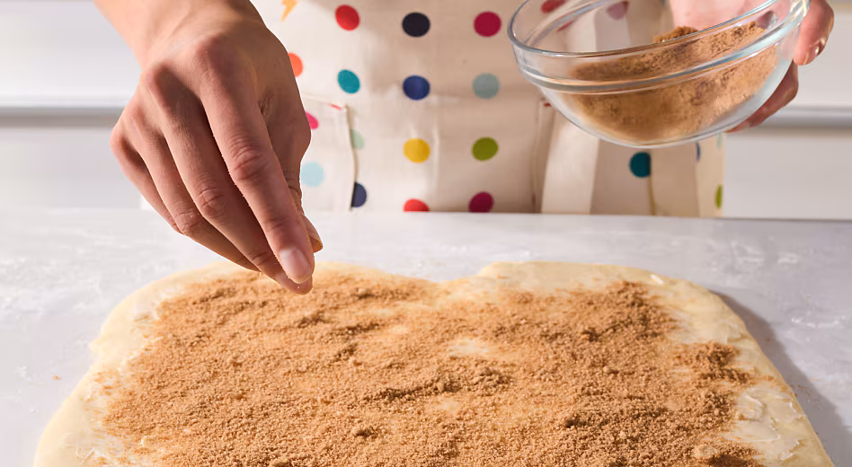 Roll the dough out on a lightly floured surface until it’s around a quarter inch thick. Spread your softened butter over the dough, then sprinkle with your filling mixture.