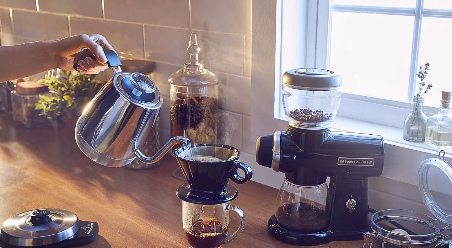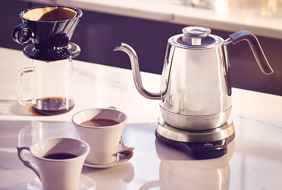 Gooseneck kettles feature a unique spout that gives you more control over your pour to ensure evenly saturated grounds. KitchenAid® gooseneck kettles offer precise pour control with the addition of three unique flow rate settings to quickly and easily adjust your pouring rate for a range of brews.