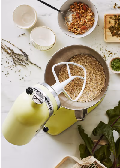 Substituting with banana is most effective when the banana is thoroughly mashed and free of noticeable chunks. You can use a KitchenAid® stand mixer equipped with the Flat Beater accessory to prep bananas for baked goods. Simply peel ripe bananas, add them to your KitchenAid® stand mixer bowl and beat using the Flat Beater accessory on speed 2-4 until you reach a creamy, lump-free consistency.