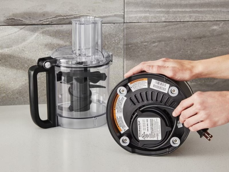 Once dry, reassemble your food processor before storing. If you keep your food processor in a cabinet or on a shelf in your pantry, wrap the power cord around the cord storage on the bottom of the base (if present) or around the base itself. Some appliance models, such as the KitchenAid® 9-Cup Food Processor, allow you to keep the blades, drive adaptor and discs of the appliance inside the work bowl for compact storage.