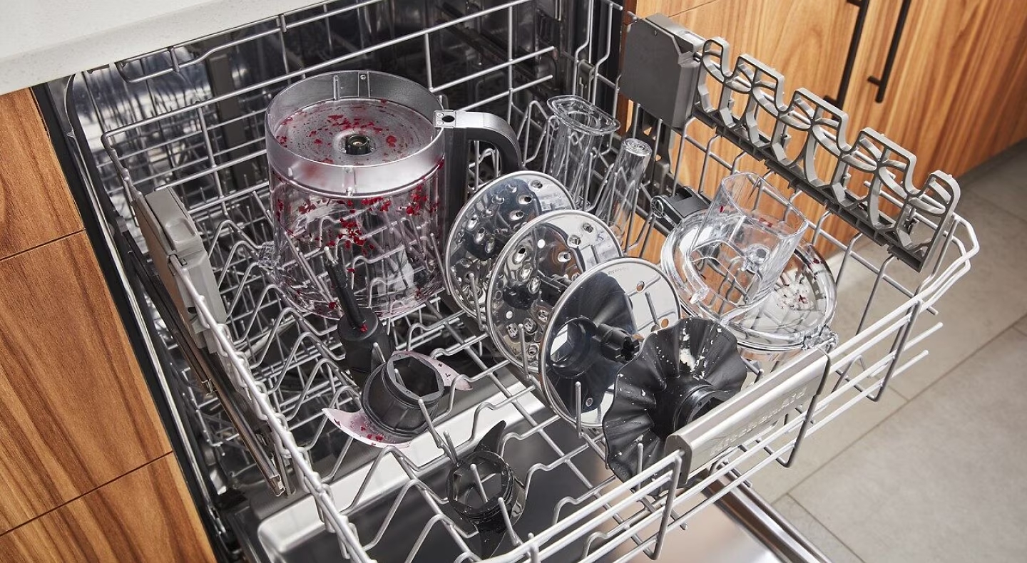 To clean the lid, bowl and blades of your KitchenAid® food processor in the dishwasher, place the parts onto the top rack of the appliance (with the bowl loaded upside down) and use gentle or normal dishwashing cycles. Avoid cycles with high temperatures.