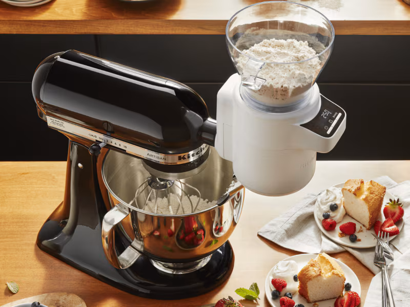 Attach the Flat Beater or Flex Edge Beater and the Sifter + Scale Attachment to your stand mixer. Secure a clean mixing bowl. If you would like more guidance on this, you can learn more with this guide on how to use a KitchenAid® stand mixer.