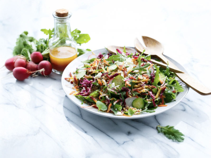 Relish the fresh flavors of a colorful mix of julienned and sliced vegetables topped with farro or your preferred grain and drizzled with a sweet and tangy dressing.