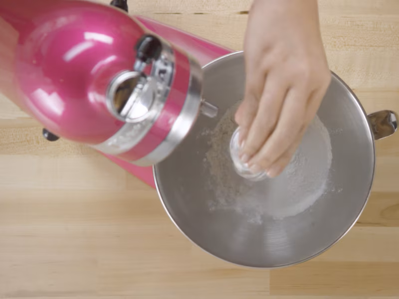 Measure and add flour, sugar, baking powder and salt to your KitchenAid® stand mixer equipped with the Flex Edge Beater Attachment. Consider using a food scale—like the KitchenAid® Sifter + Scale Attachment—to measure pancake ingredients for fluffy, consistent results. Set your stand mixer to a low speed and mix until ingredients are thoroughly combined, or about 30 seconds.