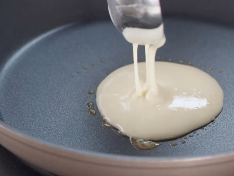 Once you’ve given the skillet a few minutes to warm up, create pancakes that are about three inches in diameter by adding two tablespoons of batter into the skillet and gently spreading it into a circle shape with the back of a spoon.