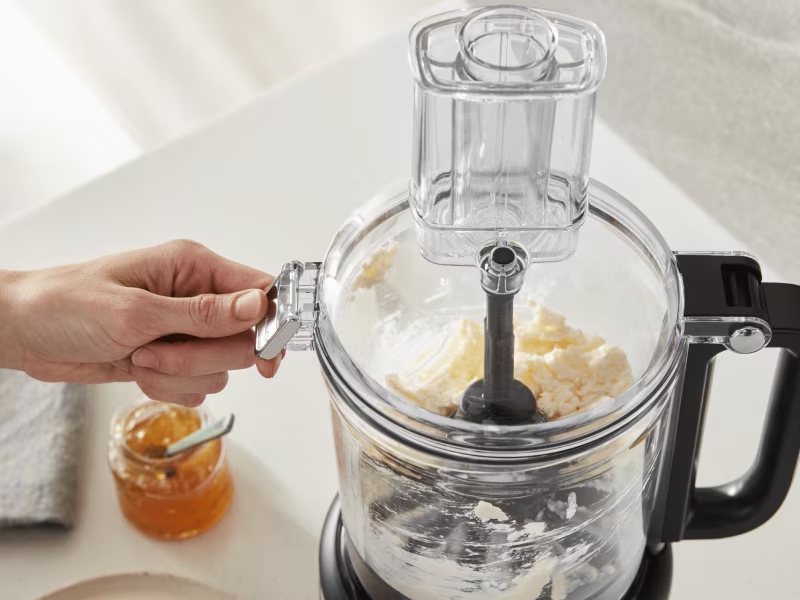 Cut cheese into ½ inch cubes to help it heat evenly and prevent burning. To shred other cheese variations that you’ll add in later, prepare a KitchenAid® food processor with the reversible slicing/shredding disc so the small, raised shredded blades are facing up. Cut cheese to fit in the feed tube and shred by applying even pressure with the food pusher. Set cubed and shredded cheese aside.