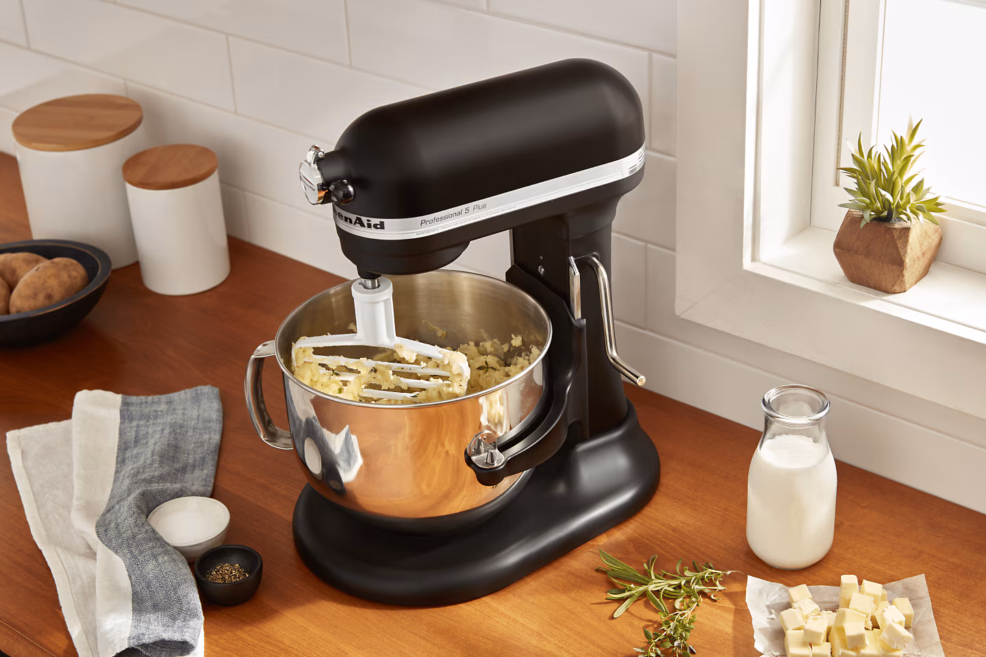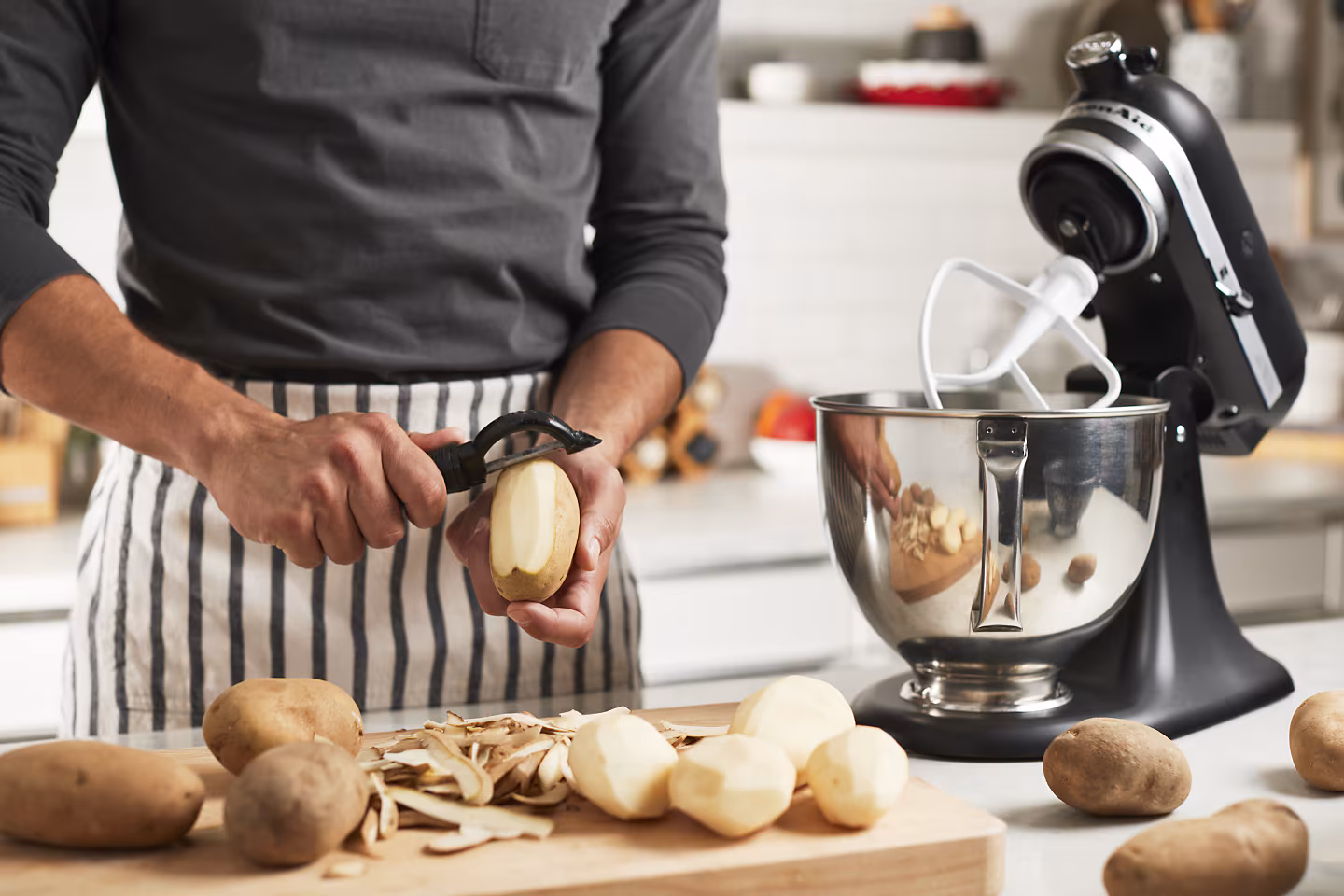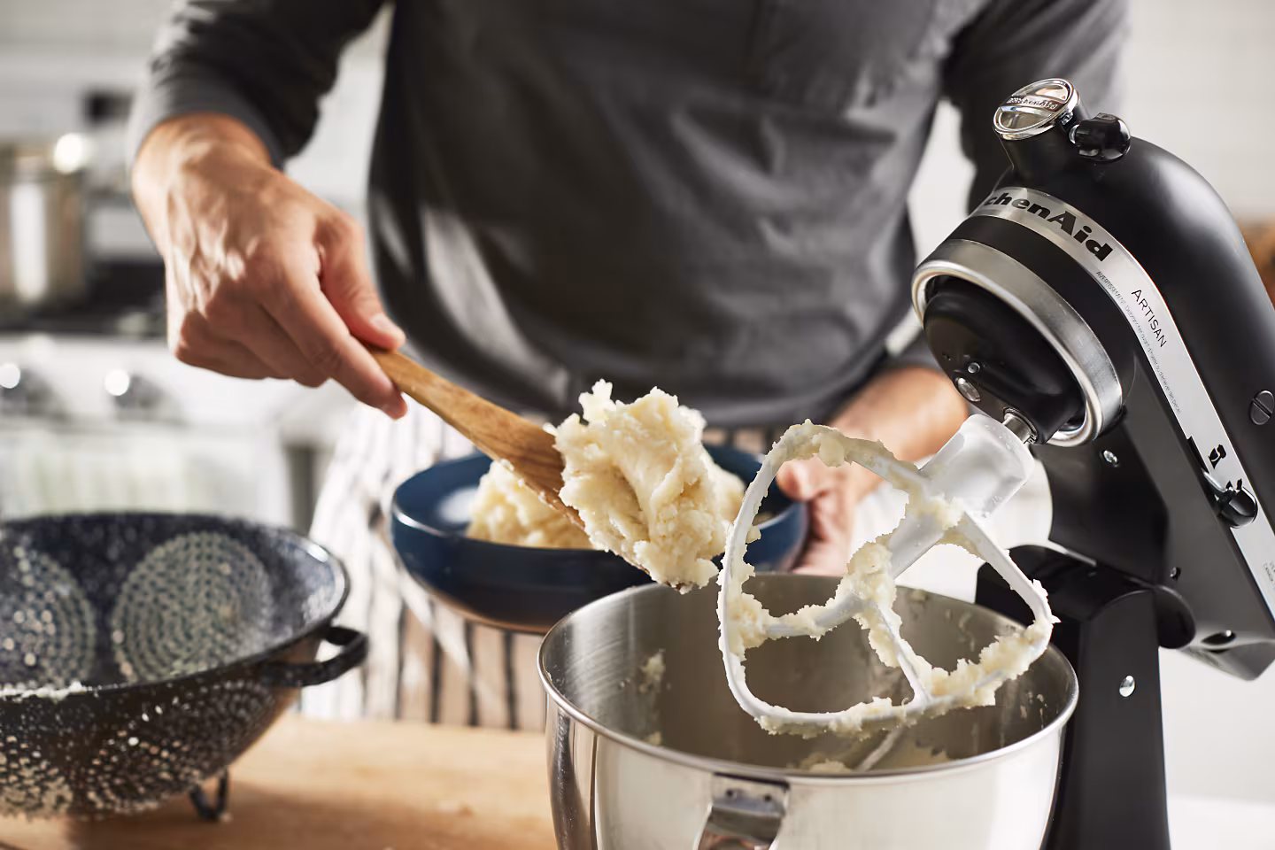 The most popular KitchenAid® accessory for mashed potatoes is the flat beater or the pastry beater [1]. Either one can mash the potatoes without overworking them, so you don’t end up with sticky, tacky potatoes. If you prefer a whipped texture, switch to the wire whip after beating the potatoes to get a light, fluffy consistency. Learn more about what this powerful and versatile appliance can do with the attachment buying guide.
