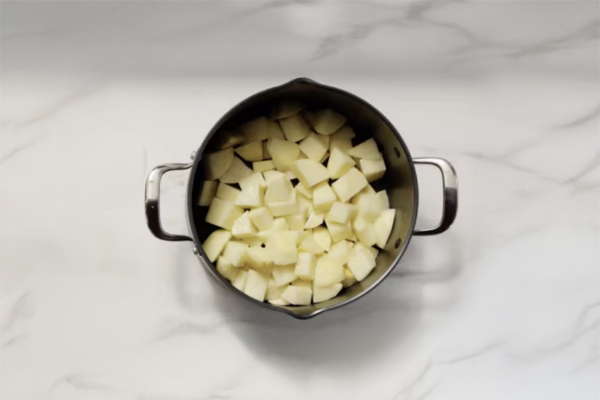Cube potatoes with the skin on or off, depending on your preference. Put them in a large saucepan and cover with cold water by 2 inches. Add 1/2 teaspoon sea salt and bring to a boil. Reduce heat to low and simmer until the potatoes are easily pricked with a fork, about 15 to 20 minutes. Drain them in a colander.
