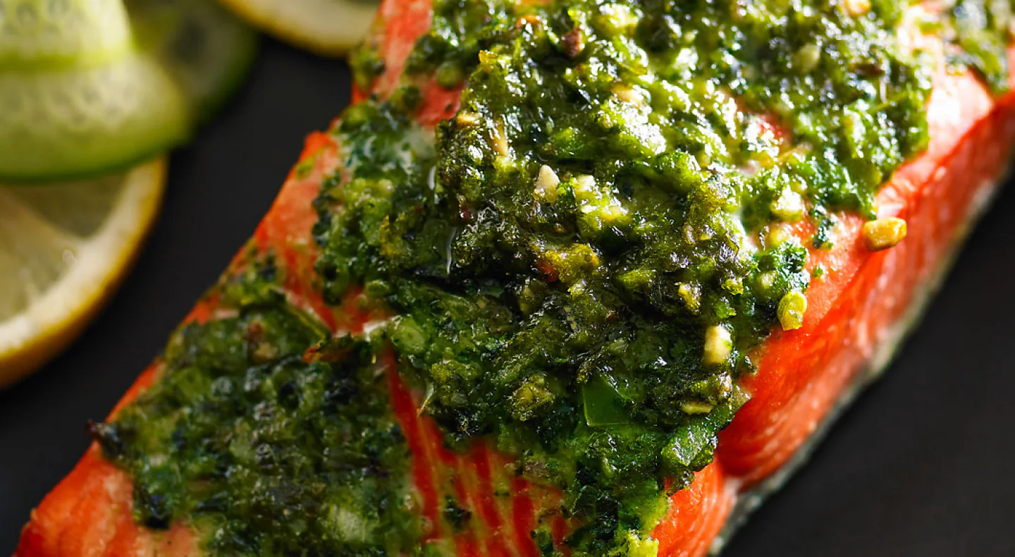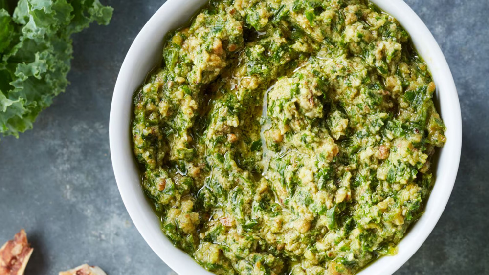 Pesto is an Italian sauce that combines herbs, oil, nuts and parmesan cheese to create a fresh and rich flavor profile. The word “pesto” in Italian translates to “pound,” as the traditional method of making pesto was to pound ingredients together with a mortar and pestle.