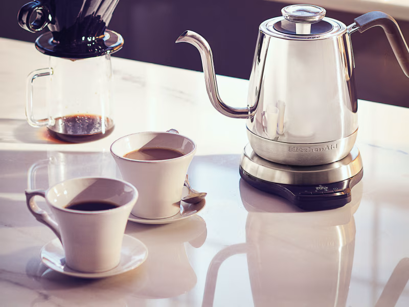 Electric gooseneck kettles from KitchenAid brand can be set to three unique flow rate settings, so you can personalize the way you pour. These kettles also have precise temperature settings that allow you to heat water to the exact point required for a variety of tea blends.