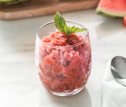 Sweet, bright and light, this Watermelon, Strawberry, Basil Granita is finished with an earthy, herbal note and makes a great palette cleanser or simple dessert on a warm evening.