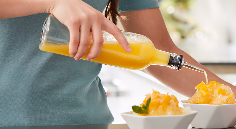 It only takes a few minutes to whip up a flavored syrup from scratch. Cook down a base of simple syrup (water and sugar) mixed with your favorite chopped up fruits on the stovetop. Once the mixture has thickened, puree it in a KitchenAid® blender and strain. You can also boil fruit juice down with a little sugar to thicken into a syrup. Be sure and consider flavorings like honey, vanilla, ginger and cinnamon too. Coffee syrups or liqueurs can also be used to create more “grown up” snow cone flavors. Unleash your creativity – the syrups and toppings you use on your snow cones are limited only by your imagination.