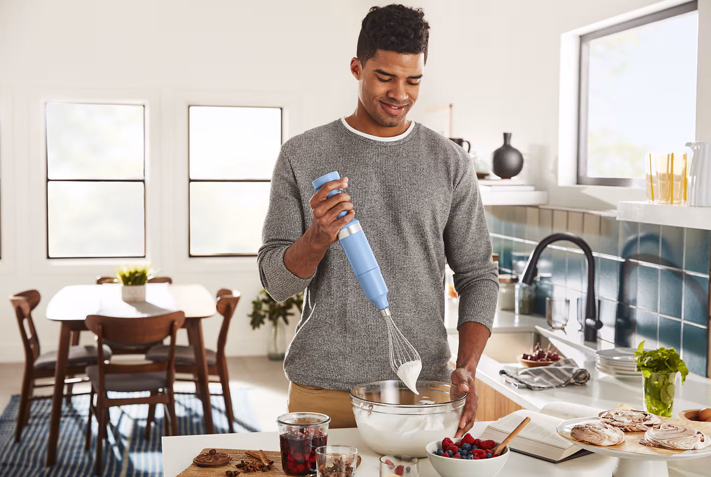 Achieve delicate, airy whipped cream at home using a KitchenAid® immersion blender with Wire Whisk Attachment on select models. If you don’t have a blender in your kitchen, you can still achieve the same light and fluffy whipped cream texture with alternate appliances like a KitchenAid® stand mixer or food chopper.