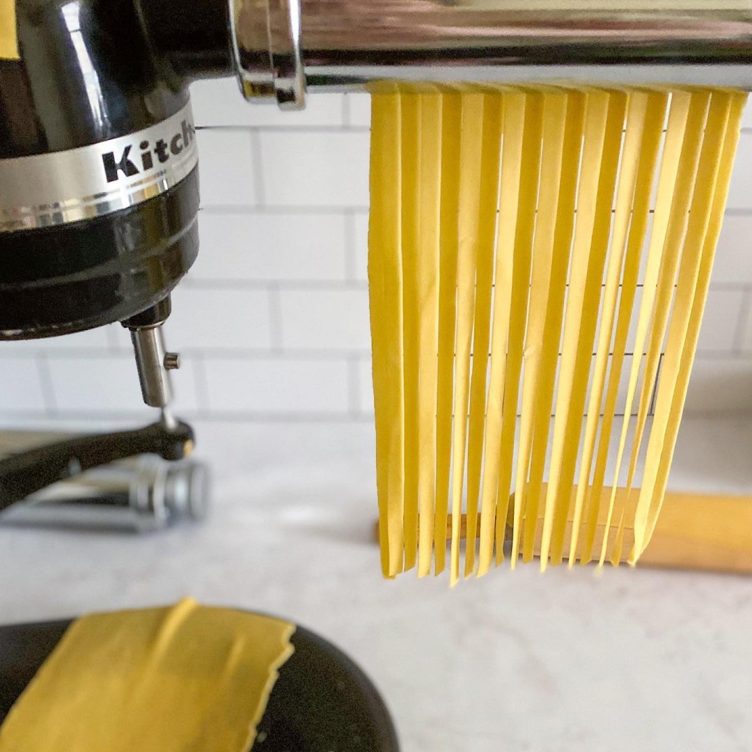 Once your pasta is cut, dust each side with a light coating of flour. This helps to prevent the long strands of noodles from sticking once you place them in the freezer.