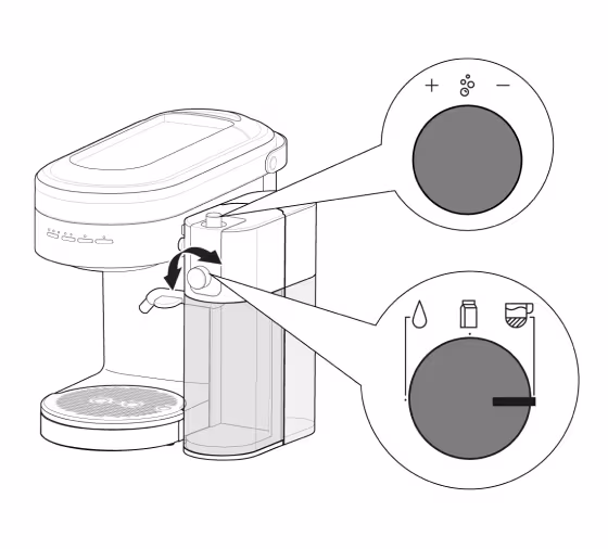 Turn the Function knob on the front of the attachment to the Froth Milk setting or the Hot Milk setting. If Frothing, rotate the Froth Level Adjustment knob on the top to increase or decrease the amount of foam. The froth level can be adjusted throughout the automatic frothing cycle by rotating the froth level adjustment knob.