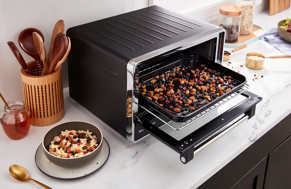Versatile air fryers like the Digital Countertop Oven with Air Fry from KitchenAid brand can be set to a low temperature over a long period of time to dehydrate foods like veggies, fruits, jerky, fruit leather and more. Use this setting to add dehydrated salmon jerky to your next charcuterie board, dried bananas to granola or dried cinnamon apple rings to your favorite seasonal cocktail.