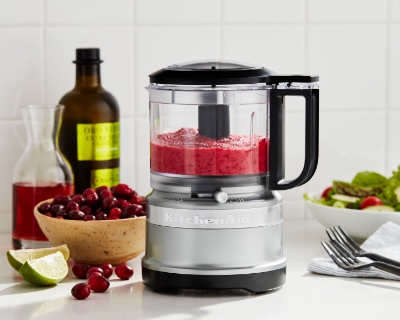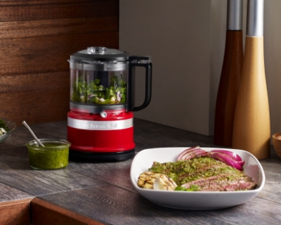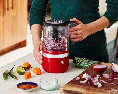 Made up of an electric base, small work bowl and a multipurpose blade, a food chopper is a compact appliance that can quickly chop, mix, puree, mince or emulsify ingredients. They typically feature a 1–5 cup bowl and pulse ingredients at the touch of a button to add precision to the process. Select KitchenAid® food choppers include a whisk accessory so you can also whisk, whip and stir.