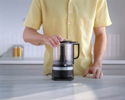 Press down on the “pulse on” button. Let up on the button frequently for optimal control over ingredient consistency. Some food choppers—like KitchenAid® 3.5 and 5 Cup Food Choppers—come with a drizzle basin located on top of the lid so you can add liquid ingredients for salad dressings, sauces and more.