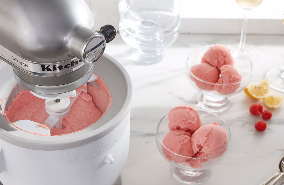 You can experiment with different types of cream and milk to achieve a range of results. In general, the higher the fat content, the thicker and richer your ice cream will be. If you’re looking for a lightened-up ice cream or or a vegan ice cream recipe , try lower fat dairy or alternatives like almond and oat milk. Coconut milk is another popular non-dairy ice cream ingredient that lends its own unique flavors and textures to ice cream. This Raspberry Ripple ice cream recipe for your Ice Cream Maker attachment uses coconut milk alongside cacao butter and soy or almond milk for a vegan ice cream dream. Curious about other frozen treats? The shave ice attachment lets you make snow cones, Italian ice and more.