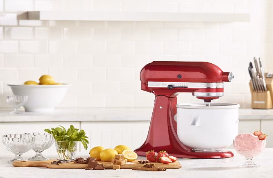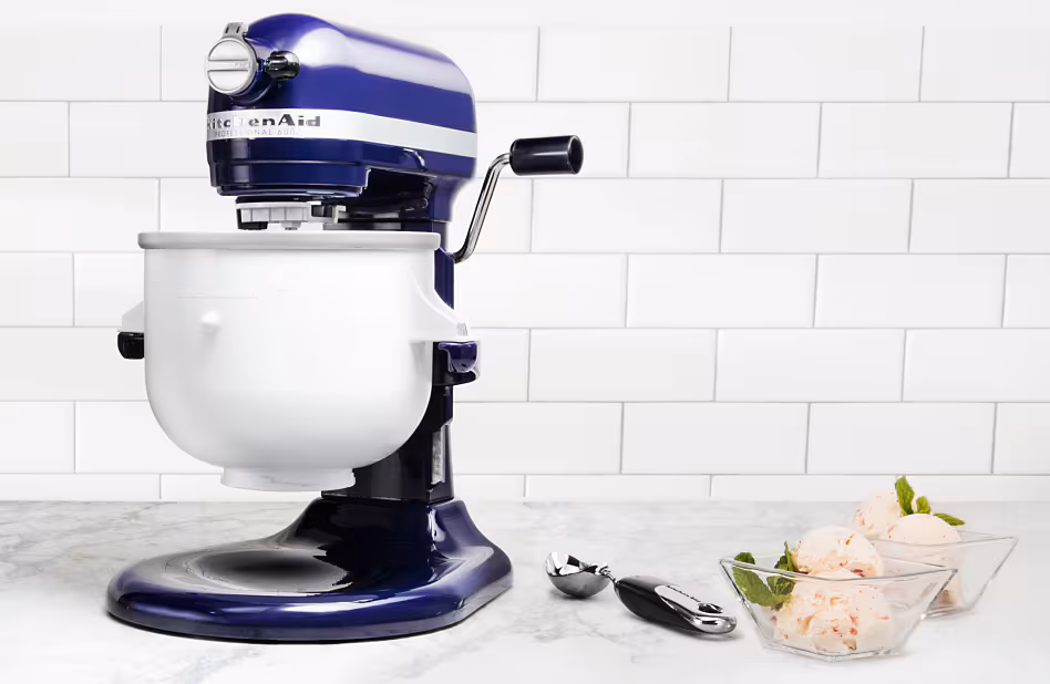 The KitchenAid® Ice Cream Maker attachment is a specialized bowl attachment for KitchenAid® stand mixers [1] that allows you to make up to 2 quarts of ice cream, gelato, sorbet and more. Just turn your mixer on to stir, add your liquid base to the bowl, churn your ice cream and freeze for a creamy, homemade frozen dessert. The Ice Cream Maker attachment is compatible with all KitchenAid® stand mixers except the 3.5 qt mini and the KPM5 bowl-lift models.