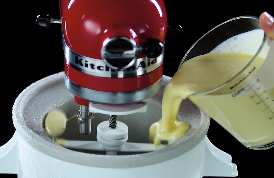 Important: Pouring batter into the freeze bowl before starting the stand mixer may cause the batter to freeze prematurely and lock the dasher.