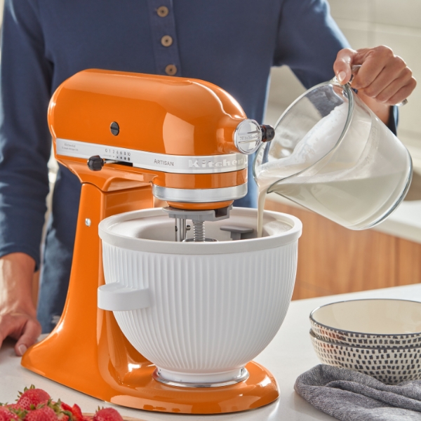 Attach your KitchenAid® Ice Cream Attachment1 to your stand mixer and set the mixer on the Stir setting, then add the chilled ice cream mixture to the bowl. Churn for 20–30 minutes or until a soft-serve texture is achieved.