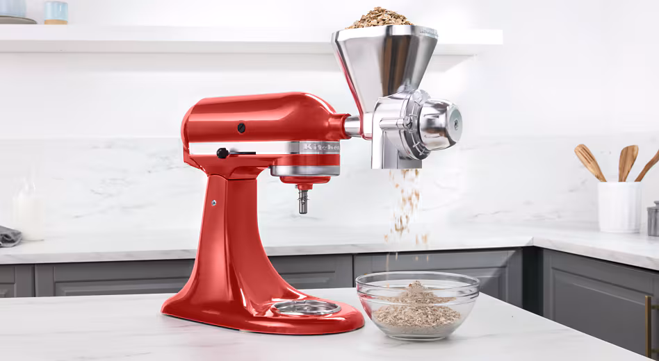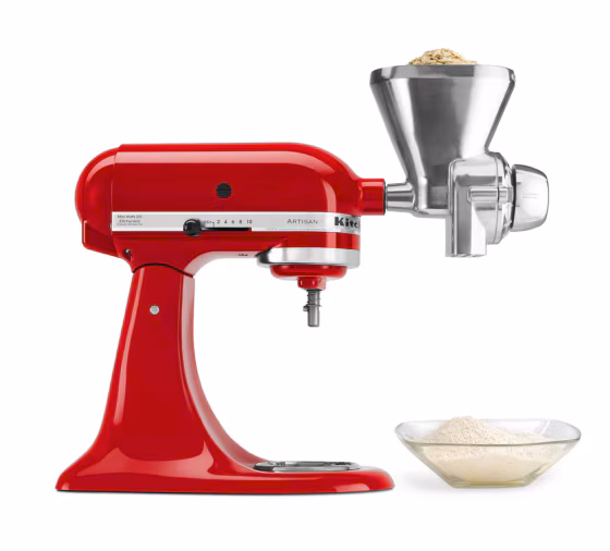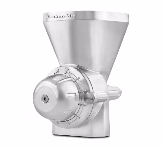 You can achieve a variety of textures using an All Metal Grain Mill attachment for your KitchenAid® stand mixer. The mill attaches to the power hub on your stand mixer and provides a continuous-feed grind that ranges from very coarse “cracked” grain that can add texture to bread to a fine grind for delicate baked goods like pastry dough or cake. You can mill any low-moisture grains, legumes and nuts to experiment with flavors and textures in your favorite recipes.