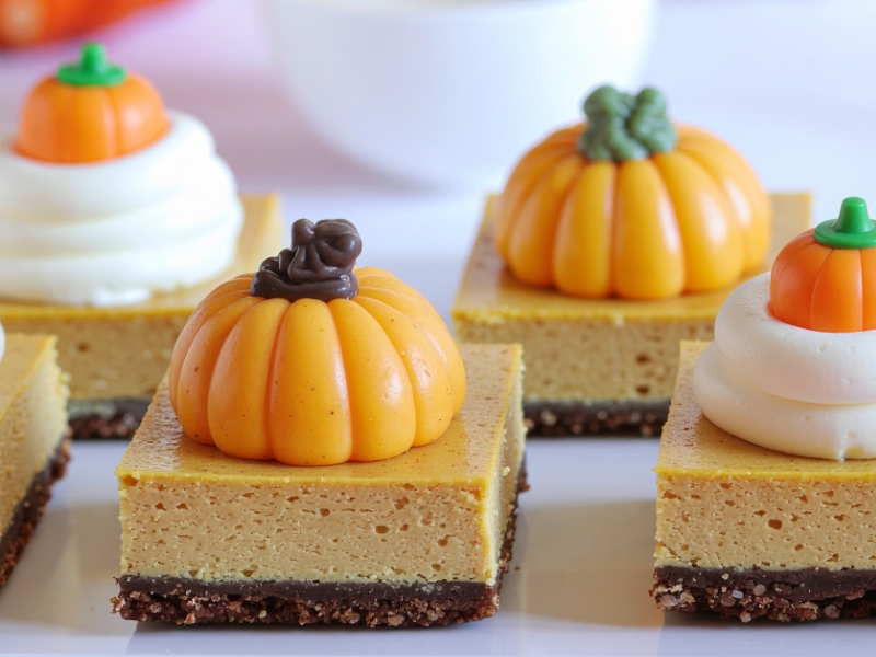 These festive and decadent cheesecake bars provide the perfect opportunity for working on your decorating skills. This spiced cream cheese and pumpkin mixture sits atop a chocolate cookie crust and is adorned with piped frosting ghosts, pumpkins and candy corn. Quickly process cookie sandwiches into crumbs, combine the cheesecake mixture and whip frosting using a KitchenAid® stand mixer.