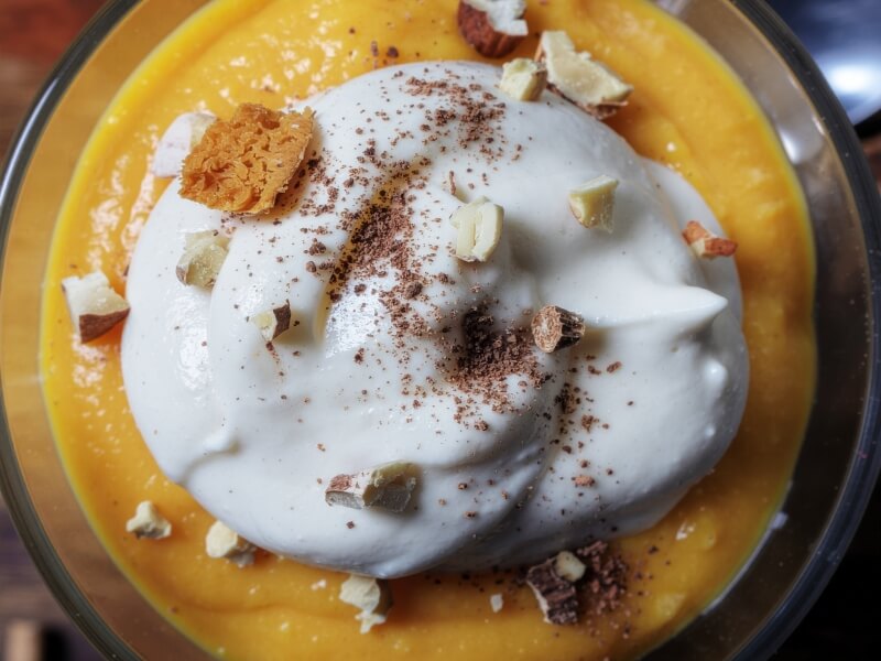 Serve autumn in a glass with this silky and spongy mousse recipe. Indulge in classic fall flavors—including maple, nutmeg, allsplice, pumpkin, cinnamon and more—when you use a KitchenAid® hand mixer to form the stiff peaks of a delicate Swiss meringue, then fold it into a white chocolate and pumpkin mixture. Pipe the mixture into serving glasses and top with maple-glazed pecans for a luxurious treat.