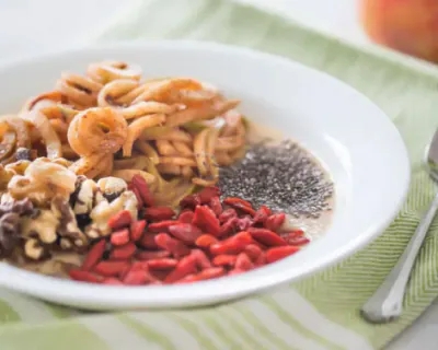 Treat your tastebuds to the flavors of fall with this smoothie bowl. The blended greek yogurt, oats, maple syrup and ground cinnamon base is topped with sautéed apple noodles, walnuts, goji berries and chia seeds to create an irresistible combination of flavors and textures. Add the KitchenAid® Spiralizer Plus with Peel, Core and Slice attachment to the power hub of the KitchenAid® stand mixer1 to create apple spirals for extra crunch.