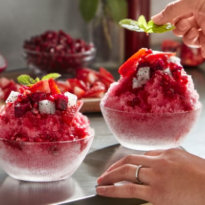 Simple, smooth and sweet, kakigori is a traditional Japanese dessert made from pure, finely-shaved ice and topped with fruity syrups, condensed milk or ice cream. This recipe uses a few simple ingredients to craft a stunning display without taking long to create. With the help of the KitchenAid® Stand Mixer Shave Ice Attachment, learn how to experiment with toppings and make your own version of kakigori.