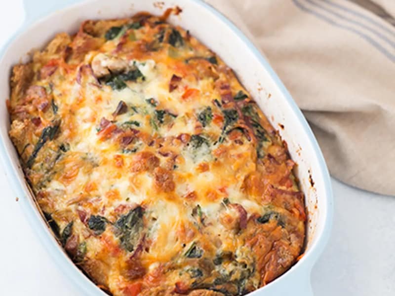 A mouthwatering strata can be made by layering day-old bread into veggies, meats and cheese, topping it with an egg and milk mixture and baking it in the oven. A savory bread pudding is also considered a strata.