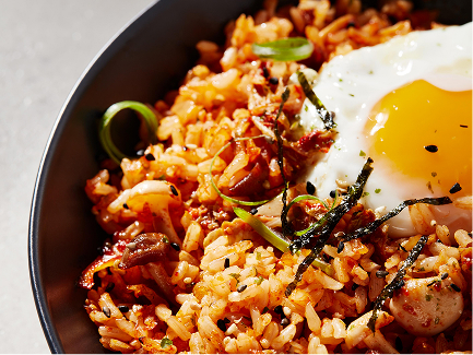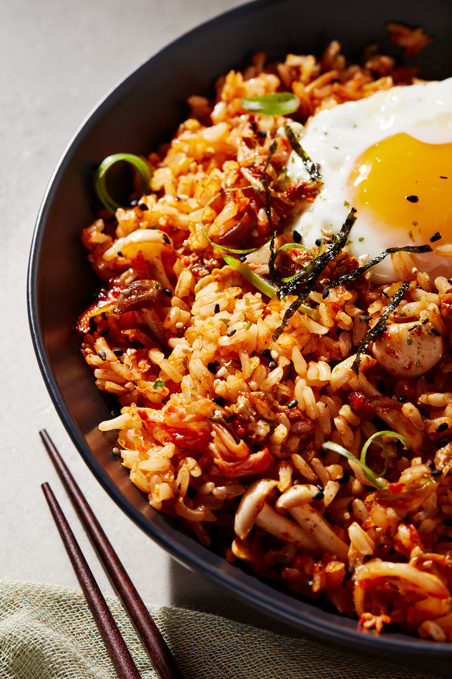 Add in the chopped kimchi and kimchi juice over the rice, stir to fully incorporate, then press rice into a flat layer in the pan. Fry, undisturbed, for another minute. Turn off heat, top with chopped green onions and crumbled seaweed, stir, then serve.