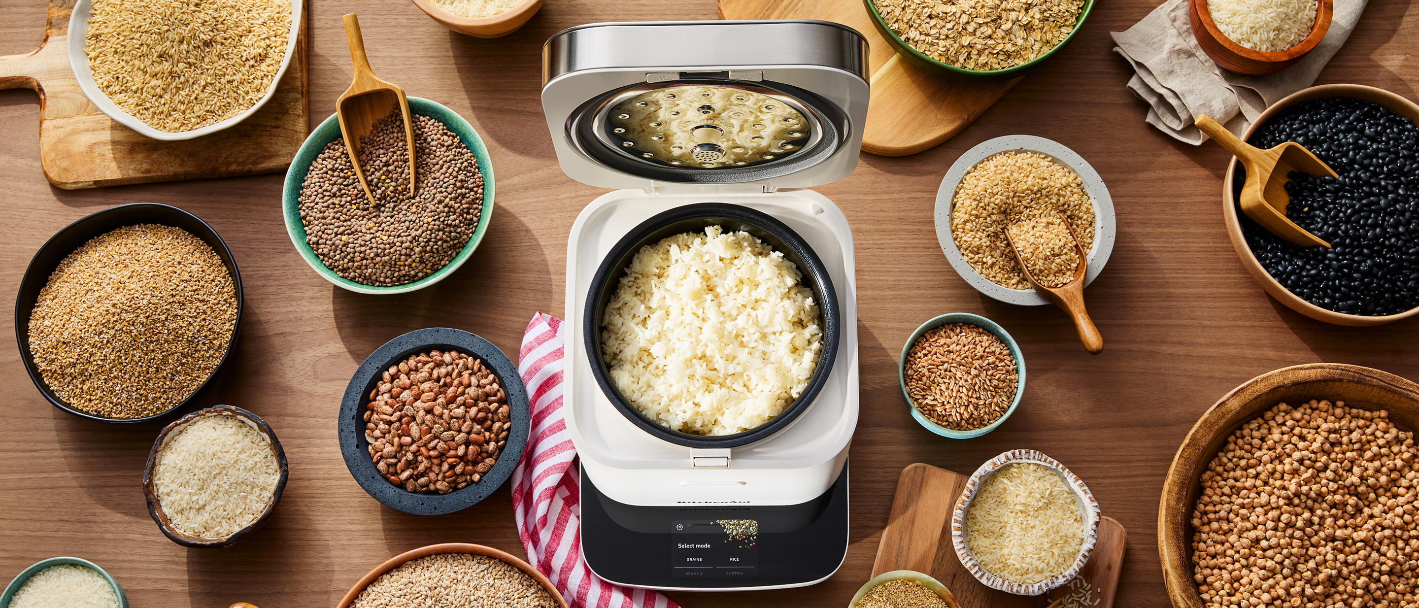The KitchenAid® Grain and Rice Cooker is a streamlined experience. Just select what you're cooking from one of 16 preset options, then add your ingredients to the cooking pot. The KitchenAid® Grain and Rice Cooker automatically senses how much grain you’ve added using an integrated scale, dispenses the right amount of water from the tank, and then simmers to the perfect texture, every time.