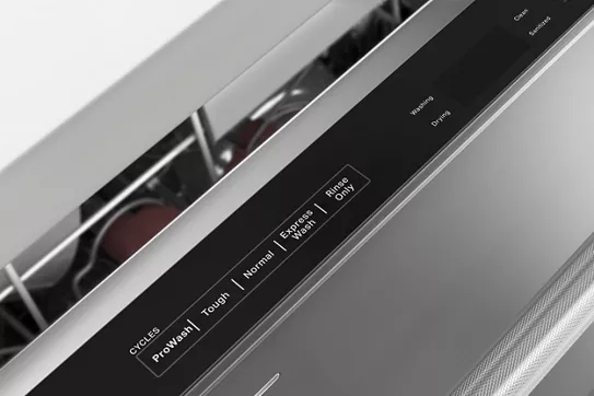 are tucked away on top of the dishwasher door for a clean look to match your kitchen style. An indicator light on the front of the door changes colors to subtly display cycle progress.