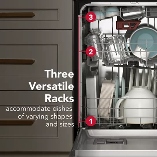 provide complete cleaning coverage for dishes across all three racks, eliminating the need for pre-rinsing. With more than double the number of jets* than the leading competitor's third rack model, it ensures targeted cleaning for dishes on every level.