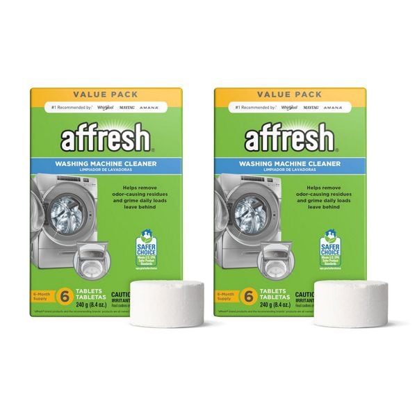 affresh® 2 Pack of Washing Machine Cleaner Tablets – 12 Countaffresh® Washing Machine Cleaner deep cleans to help remove the odor-causing residues and grime that daily loads leave behind. The time-release tablets are EPA Safer Choice certified, septic-safe and designed to clean inside all machines, including HE (High Efficiency). Use monthly or every 30 cycles for a consistently clean machine.