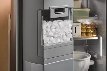 maximizes ice storage while maximizing space on freezer shelves by moving the ice bin to the door. The bin holds up to 4.3 lbs of ice, is clear so you can quickly see ice levels and can be removed to easily fill pitchers or coolers.