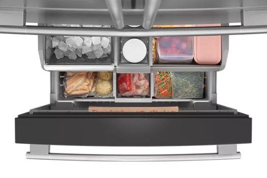 from this impressively large French Door Refrigerator makes room for every farmer's market haul and brings convenience with customizable storage spaces for your unique ingredients.