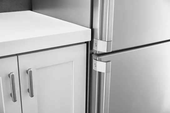 allows this freestanding refrigerator to fit nearly flush with surrounding cabinetry to offer a built-in look and allow more room to move in your kitchen.