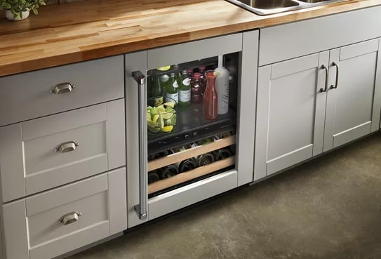 provides a built-in look within a standard 24" base cabinet, so your style stands out, not the appliance. Hidden hinges allow the beverage center door to sit flush with surrounding cabinet fronts when closed yet easily swing open a full 115 degrees.