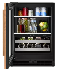 provides a built-in look within a standard 24" base cabinet, so the beverage center seamlessly blends in, letting your style stand out. Hidden hinges allow the beverage center door to sit flush with surrounding cabinet fronts when closed yet easily swing open a full 115°.