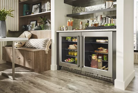 provides a built-in look within a standard 24" base cabinet, so your style stands out, not the appliance. Hidden hinges allow the refrigerator door to sit flush with surrounding cabinet fronts when closed yet easily swing open a full 115 degrees.