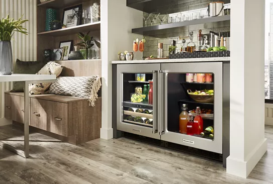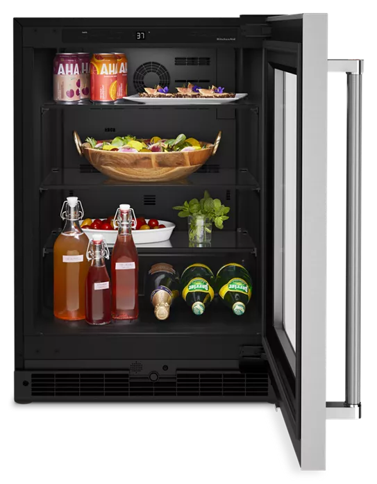 provides a built-in look within a standard 24" base cabinet, so your style stands out, not the appliance. Hidden hinges allow the refrigerator door to sit flush with surrounding cabinet fronts when closed yet easily swing open a full 115 degrees.