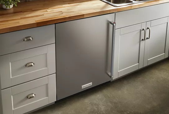 provides a built-in look within a standard 24" base cabinet, so your style stands out, not the appliance. Hidden hinges allow the refrigerator door to sit flush with surrounding cabinet fronts when closed yet easily swing open a full 115 degrees.