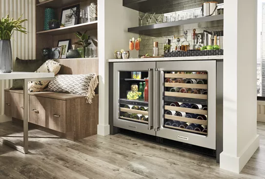 provides a built-in look within a standard 24" base cabinet, so your style stands out, not the appliance. Hidden hinges allow the wine cellar door to sit flush with surrounding cabinet fronts when closed yet easily swing open a full 115 degrees.
