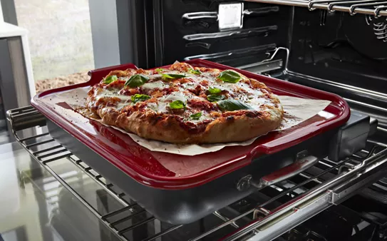 Connect, register or call to get your baking stone by mail at no additional cost. It stone-bakes a large 14"" pizza, seared kabobs or crab cakes right in your oven. The attachment fits interchangeably onto the base pan and heating element and connects to a powered hub in your oven to preheat in half the time of a non-integrated stone and alert you when preheating is complete. Easy-clean, dishwasher safe.