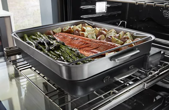 Connect, register or call to get your steamer by mail at no additional cost. It fits interchangeably onto the base pan and heating element and connects to a powered hub in your oven, enabling control through the oven's display so you can precisely steam-cook vegetables, entrees or even a complete dinner for four of salmon, potatoes and asparagus. The attachment can also be used with the Steam Assist mode to create a humid cooking environment ideal for baked goods, breads and roasts. Easy-clean, dishwasher safe.