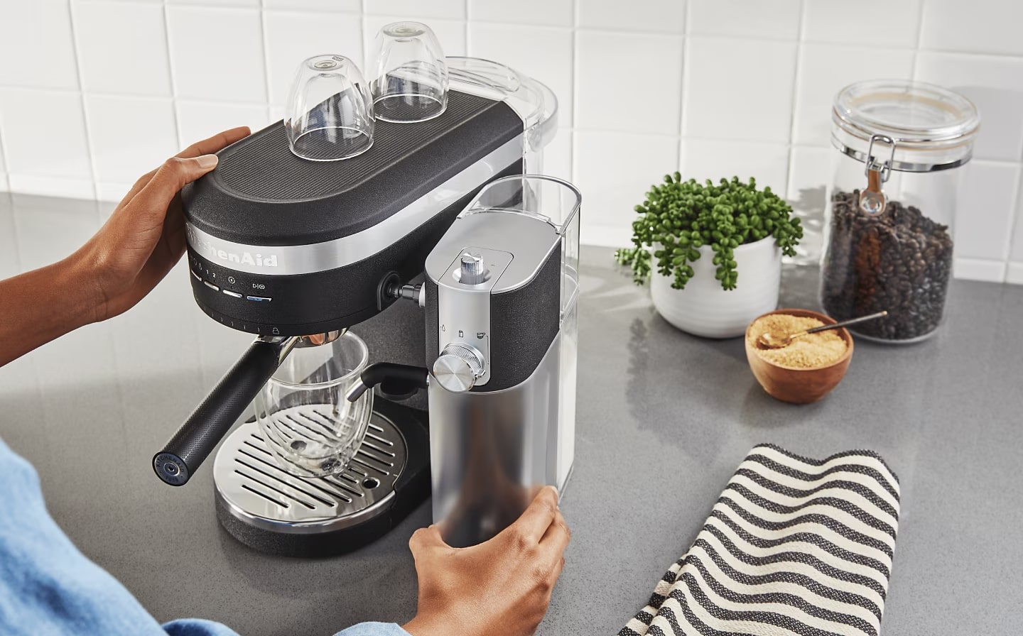 You can clean most milk frothers relatively quickly with just a handful of supplies, but how to clean a milk frother varies by type. Read the guide below to learn what supplies you’ll need to clean your milk frother. Find out how to maintain a KitchenAid® Milk Frother Attachment that pairs with the KitchenAid® Semi-Automatic Espresso Machine, and learn how to wash a milk frother that’s manual, automatic or a handheld whisk.