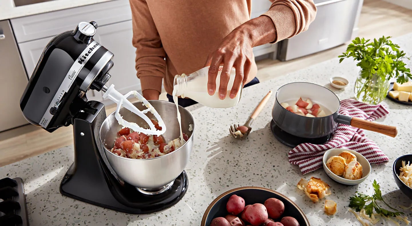 Whether mixing cake batter, kneading dough, shredding chicken or whipping up meringue, using KitchenAid® stand mixer accessories can streamline your making. Stand mixer accessories include the flat beater, flex edge beater, whisk/whip, dough hook and pastry beater.